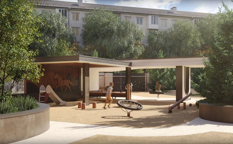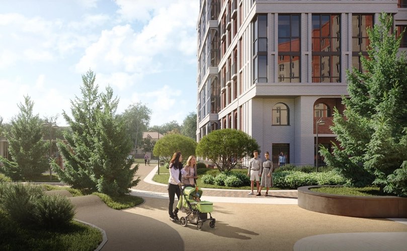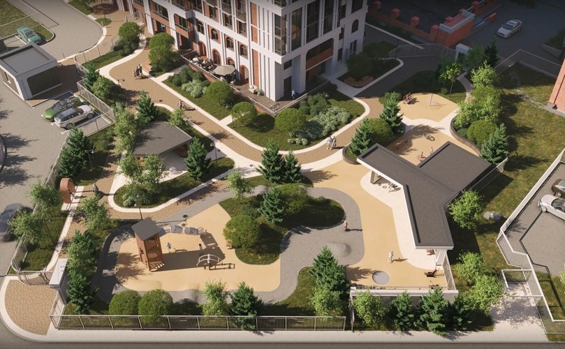 Пространство разделено исходя из потребностей детей и взрослых: есть и игровые площадки, и тихие зоны среди деревьев. А благодаря отсутствию вблизи дома широких дорог, во дворе будет спокойно и комфортно.