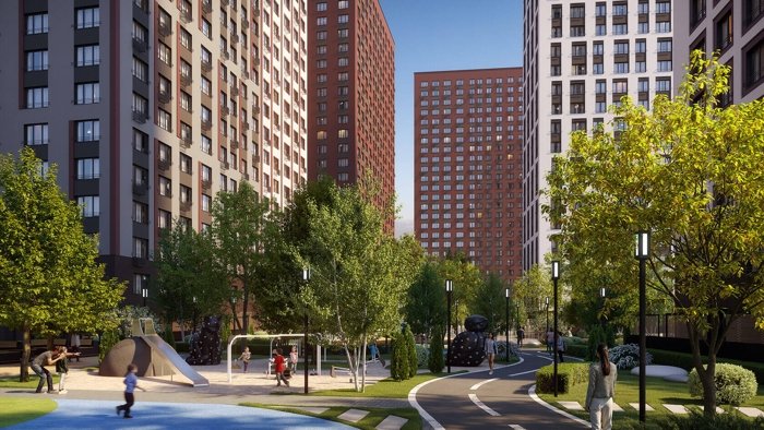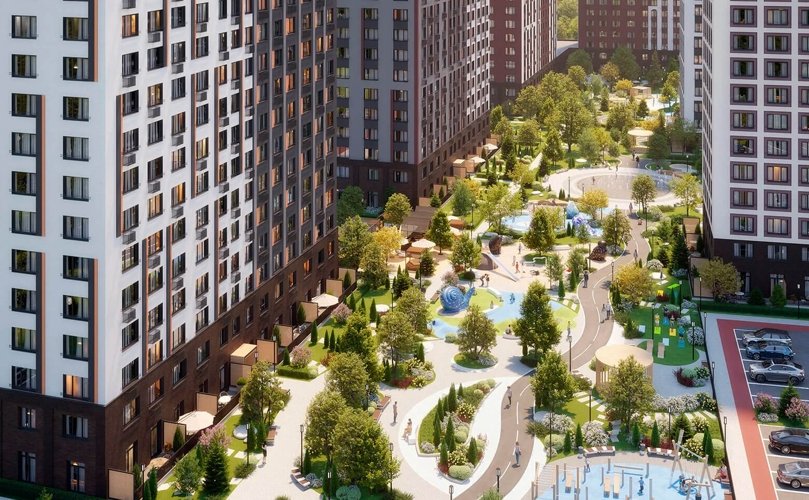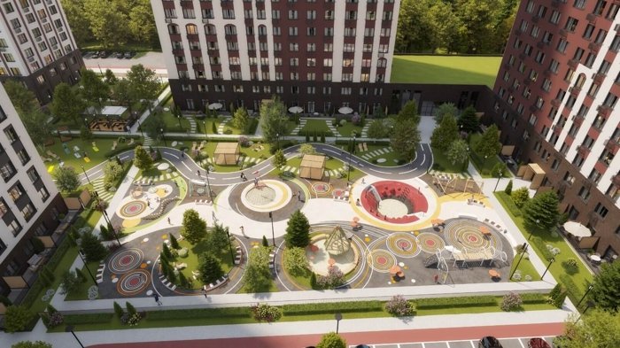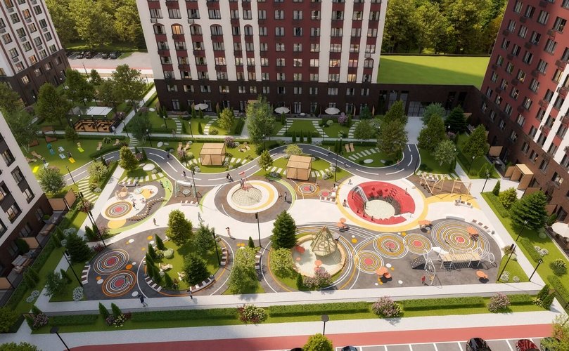 Внутренний двор закрыт от машин, на территории создано 22 тематических площадки: детские площадки, стадион, места для выгула собак, зона йоги, спортивные площадки.
